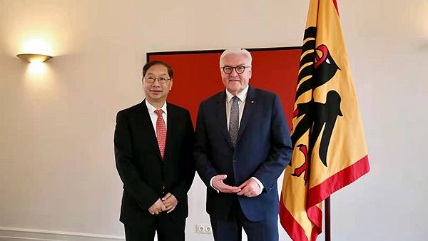 Im Dezember 2018 begrü?te Botschafter Shi Mingde (zweiter von links) den deutschen Pr?sidenten Frank-Walter Steinmeier bei dessen Staatsbesuch in China am Flughafen von Beijing. (Foto vom Interviewpartner zur Verfügung gestellt)