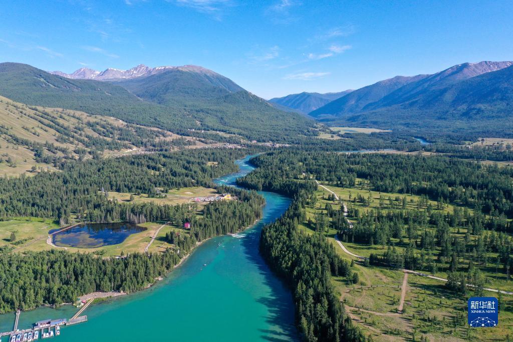 Die Luftaufnahme zeigt die wundersch?ne Landschaft in Kanas in Xinjiang. (Foto vom 19. Juli 2023, Xinhua)