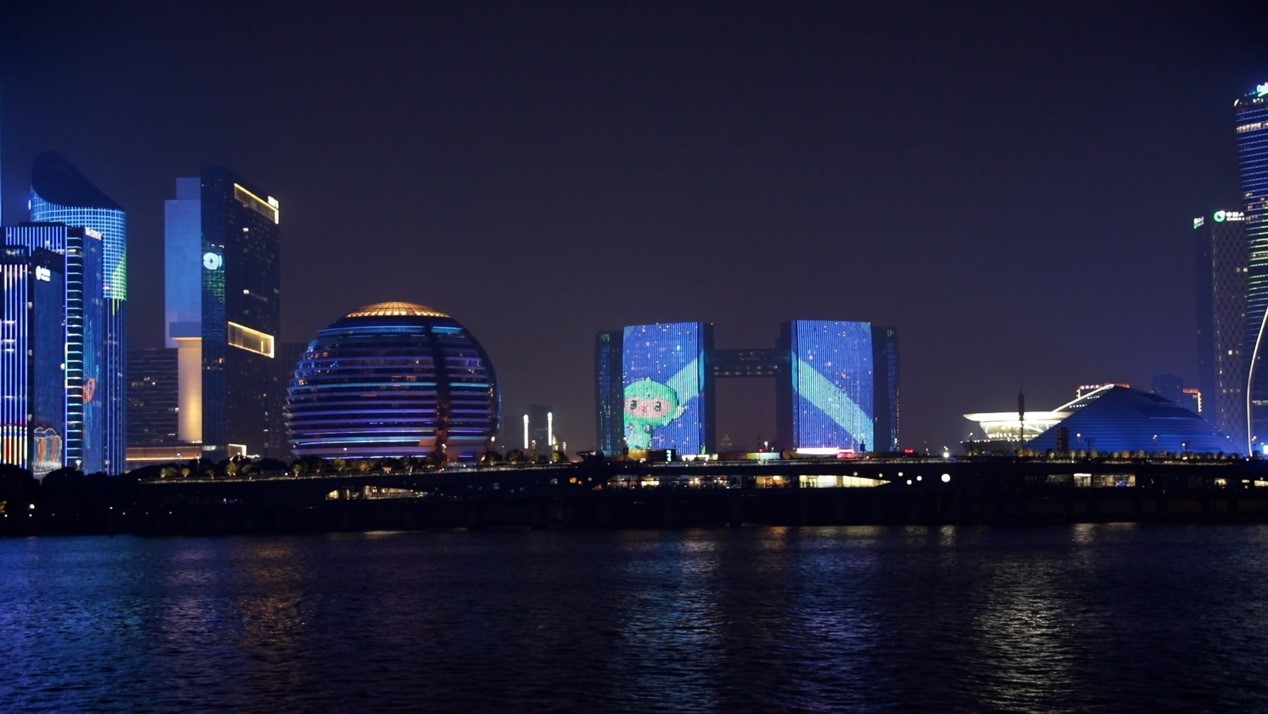 Die Lichtshow der Asienspiele spiegelt sich im Qiantang-Fluss. (Foto von Wang Jing/ People’s Daliy Online)
