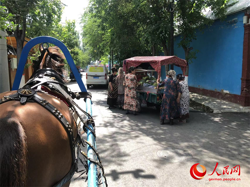 In den L?den entlang der Stra?e werden Produkte aus der Region angeboten. In einem Gesch?ft gibt es Pferdes?ttel, Geschirre und Reitpeitschen, in einem anderen handgemachte Lederschuhe und -stiefel und in einem weiteren Kleidungsstücke im uigurischen Stil. Mit kleinen Wagen, die von Pferden gezogen werden, kann man das Viertel erkunden und durch die Gassen in der Nachbarschaft fahren. Ich bekomme farbenfrohe Fassaden zu Gesicht, an denen das sogenannte Ili-Blau dominiert. Wir fahren vorbei an einer Gruppe von Frauen in langen Kleidern, die sich vor einem Gemüsestand dr?ngen, und einem Gesch?ft, vor dem Kostüme ausgestellt sind, in dem sich Frauen vor gro?en Spiegeln frisieren und schminken lassen. Immer wieder sehe ich am Stra?enrand Karren mit Melonen und Fahrer in Autorikschas, die auf Kunden warten.