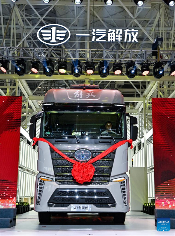 Das 60-millionste Fahrzeug der FAW Group und gleichzeitig der 9-millionste Lkw von FAW Jiefang rollte am 16. Juli 2024 in Changchun in der nordostchinesischen Provinz Jilin vom Band. (Xinhua/Yan Linyun)