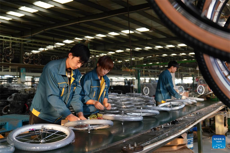 Arbeiter prüfen die Qualit?t neuer Kinderfahrr?der im Kreis Pingxiang in der nordchinesischen Provinz Hebei, 19. August 2024. (Xinhua/Mu Yu)