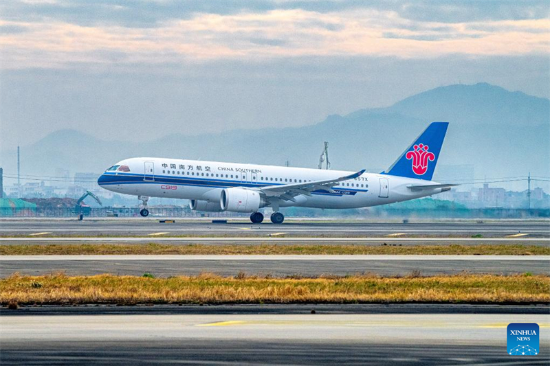Ein C919-Passagierflugzeug der China Southern Airlines hebt vom Guangzhou Baiyun International Airport in der südchinesischen Provinz Guangdong ab, 14. Januar 2025. (Xinhua/Wang Ruiping)