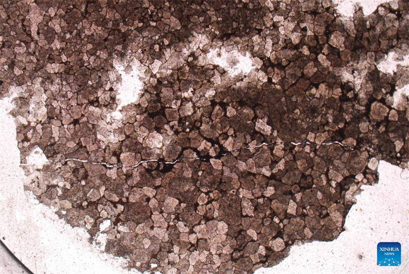 Dieses undatierte Bild wurde vom Tarim-?lfeld zur Verfügung gestellt und zeigt das mikroskopische Bild eines Gesteinsstücks, das in einer Tiefe von 10.000 Metern unter der Erde gewonnen wurde. (Tarim-?lfeld der China National Petroleum Corporation/Handout via Xinhua)