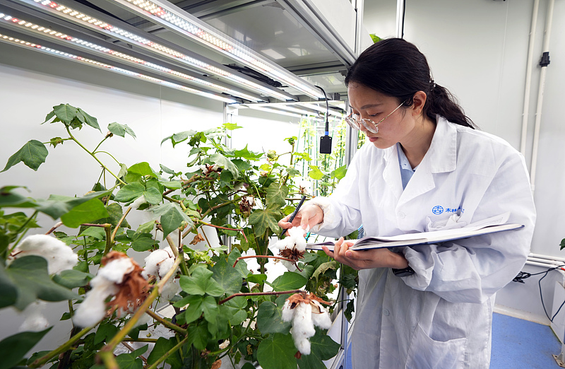 Ein Forscher arbeitet am 7. April 2025 in der unbemannten Pflanzenfabrik, die am Institut für urbane Landwirtschaft in Chengdu in der südwestchinesischen Provinz Sichuan gebaut wurde. (China News Service/An Yuan)