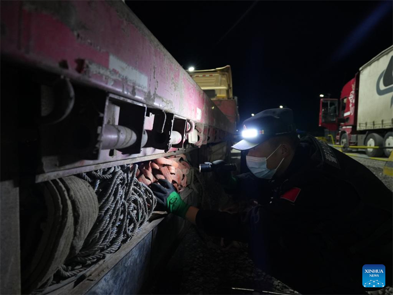 Fahrzeuge werden im Hafen von Irkeshtam im Kreis Wuqia der Kirgisischen Autonomen Pr?fektur Kizilsu im nordwestchinesischen Uigurischen Autonomen Gebiet Xinjiang am 2. Juni 2025 kontrolliert. (Foto: Fei Qiang/Xinhua)