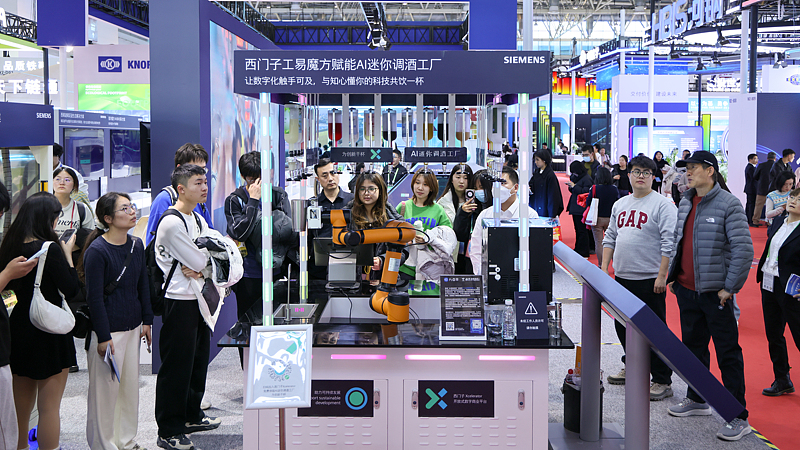 Besucher beobachten einen Roboter, der im Ausstellungsbereich von Siemens w?hrend der China International Supply Chain Expo 2024 in Beijing am 29. November 2024 Getr?nke mischt. (Foto von VCG)