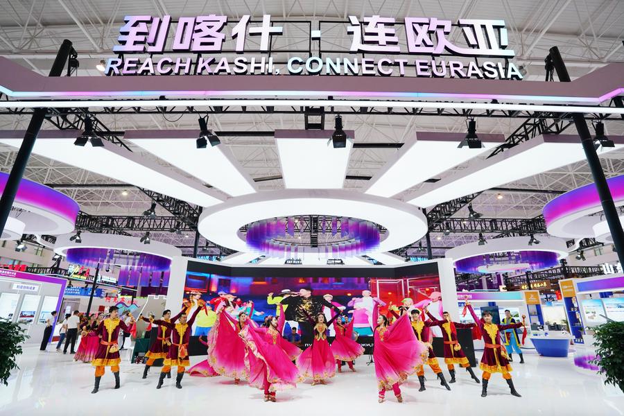Eine Tanzaufführung auf der 15. Kashgar-Central and South Asia Commodity Fair in Kashgar, im Nordwesten der Uigurischen Autonomen Region Xinjiang in China, 15. August 2025. (Xinhua/Aman)