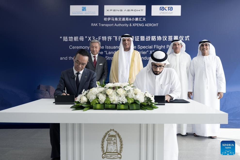 Esmaeel Al Blooshi (vorne rechts), Generaldirektor der Verkehrsbeh?rde von Ras Al Khaimah, und Zhao Deli (vorne links), Gründer von XPENG AEROHT, nehmen am 10. September 2025 an einer Zertifizierungszeremonie in Ras Al Khaimah, Vereinigte Arabische Emirate (VAE), teil. (XPENG/Handout via Xinhua)