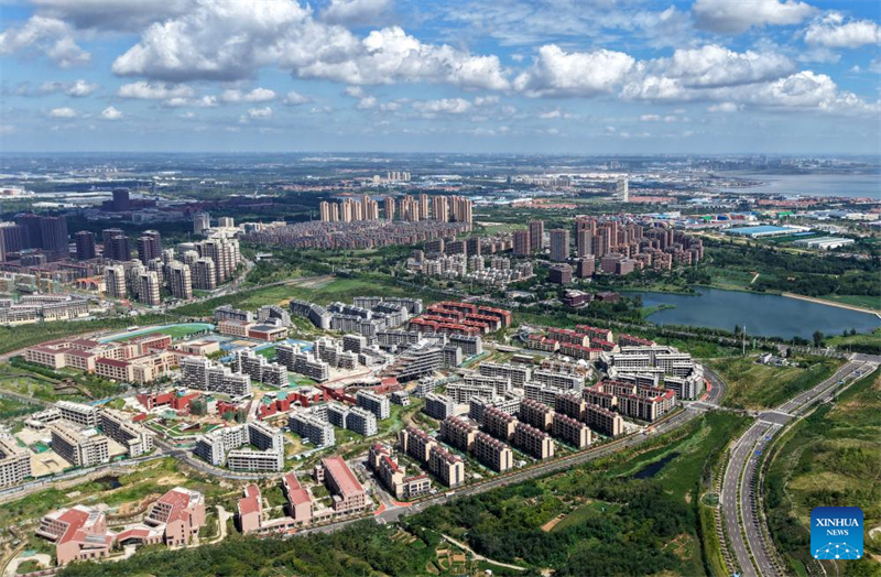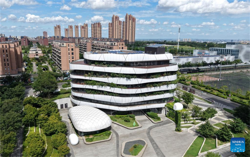 Dieses am 29. Juli 2025 aufgenommene Drohnenfoto zeigt das Passivhaus-Technologiezentrum im chinesisch-deutschen ?kopark in Qingdao in der ostchinesischen Provinz Shandong. (Xinhua/Li Ziheng)