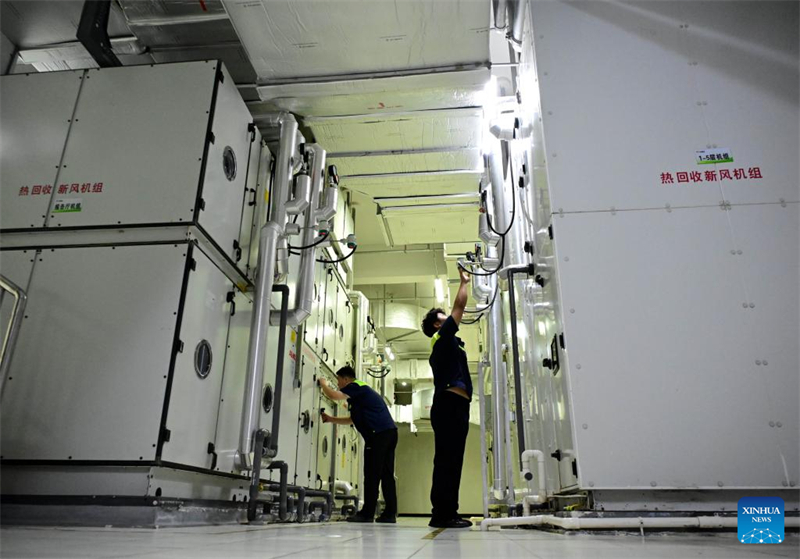 Mitarbeiter warten am 29. Juli 2025 ein Frischluft-W?rmerückgewinnungssystem im Passivhaus-Technologiezentrum des chinesisch-deutschen ?koparks in Qingdao in der ostchinesischen Provinz Shandong. (Xinhua/Li Ziheng)