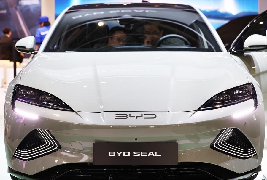 Besucher an einem Pavillion des chinesischen Autoherstellers BYD auf der Paris Motor Show 2024 am Tag für Medienvertreter. 14. Oktober 2024. (Foto: Xinhua/Gao Jing)