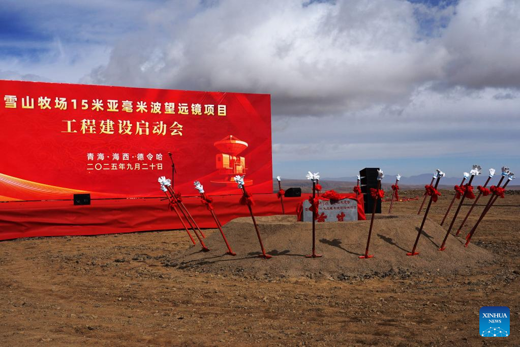 Dieses Foto vom 20. September 2025 zeigt den Startpunkt für den Bau eines neuen gro?en astronomischen Beobachtungsprojekts, des 15-Meter-Submillimeter-Teleskops Xue-shan-mu-chang (XSMT) in Delingha im Nordwesten der chinesischen Provinz Qinghai. (Xinhua/Chen Jie)