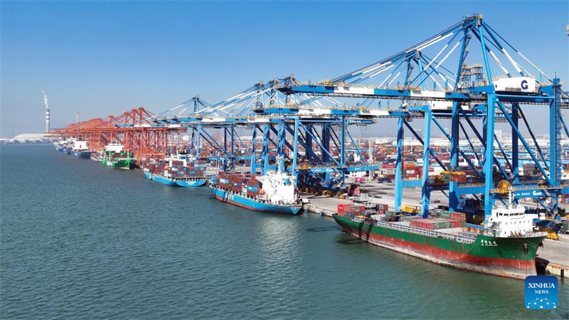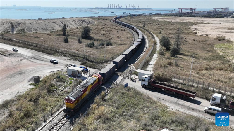 Im New International Land-Sea Trade Corridor (ILSTC) am Bahnhof Qinzhou Port East in Qinzhou City, in der Autonomen Region Guangxi Zhuang im Süden Chinas, am 29. November 2025. Die ILSTC, eine wichtige Logistikroute, die Westchina mit den Weltm?rkten verbindet, hatte laut China Railway Nanning Group Co., Ltd. (Xinhua/Zhang Ailin) bis Samstag insgesamt mehr als 5 Millionen 20-Fu?-Standardcontainer-Einheiten (Twenty Foot Equivalent Unit, TEU) Fracht transportiert. (Xinhua/Zhang Ailin)